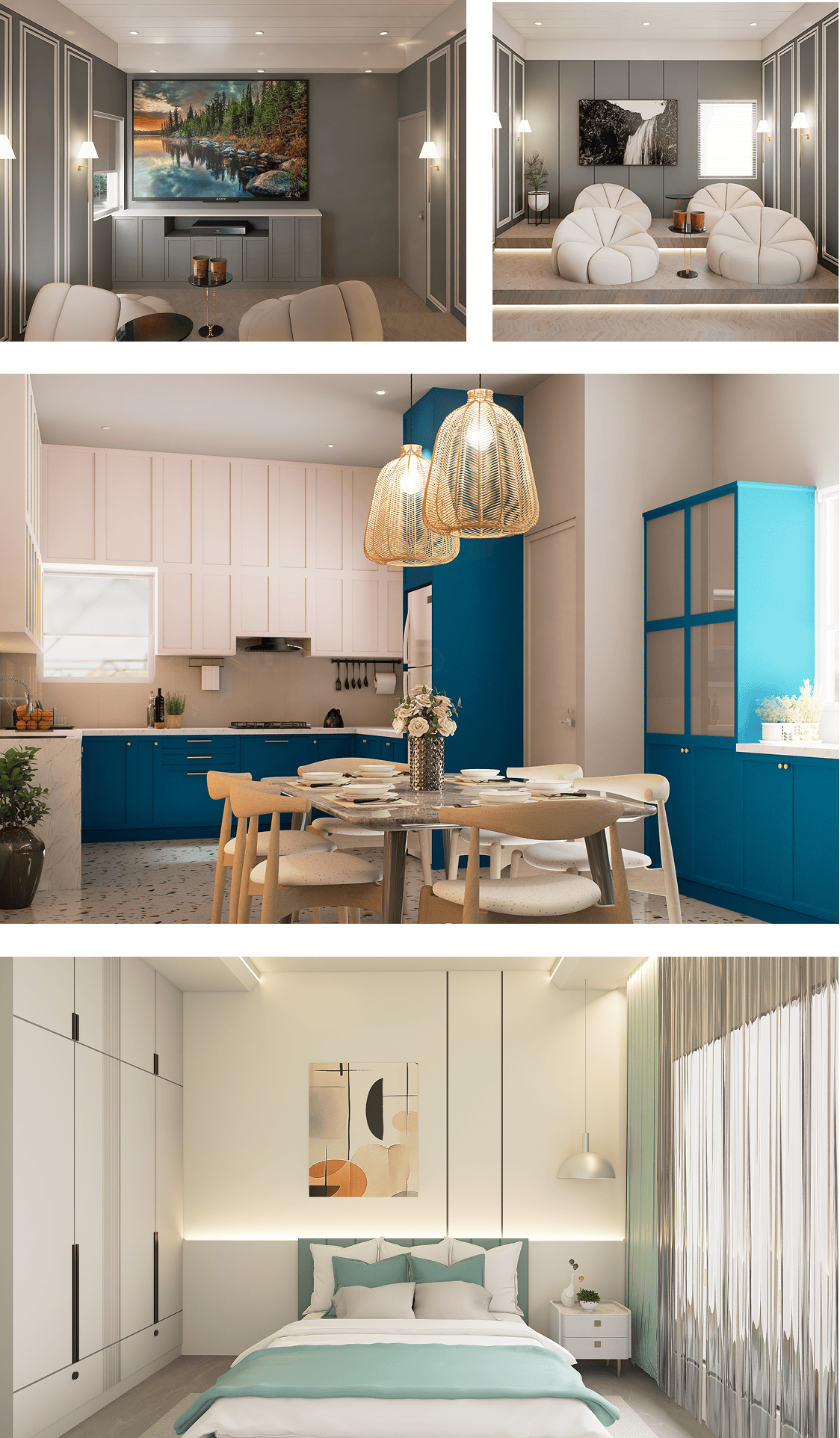 This home features a refreshing coastal blue theme, combining crisp whites, soft pastels, and bold aqua tones to evoke a breezy seaside vibe. The spaces are airy and well-lit, with clean lines and modern finishes that enhance functionality. Natural textures like rattan and wood add warmth, while the blue accents bring in a calming, ocean-inspired charm—creating a relaxed and vibrant atmosphere throughout the house.