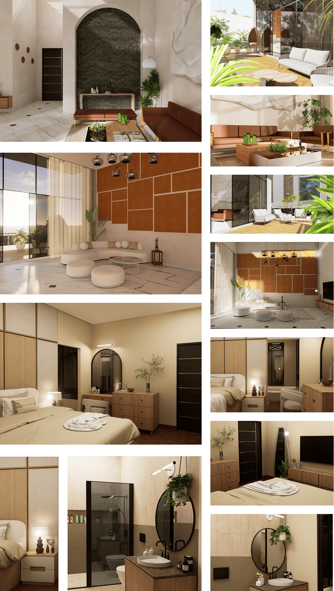 This home blends earthy tones with modern minimalism, creating a warm and serene atmosphere. Clean lines, natural textures, and subtle lighting enhance its sophisticated aesthetic. Open spaces and thoughtful decor elements—like wood paneling, soft upholstery, and indoor greenery—add comfort while maintaining elegance. Each room flows seamlessly, reflecting functionality and calmness, ideal for relaxed and contemporary living.