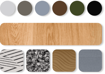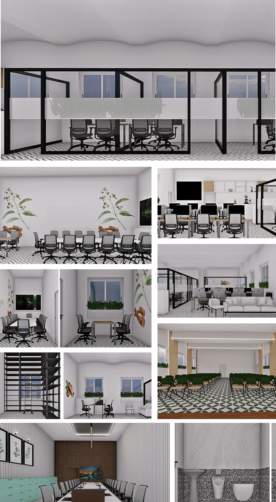 The office design blends minimalism with functionality, using sleek furniture, green accents, and open workspaces. The auditorium features bold geometric tiles, and the boardroom showcases wood textures, soft lighting, and modern aesthetics.